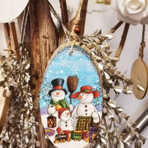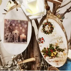 Vsak okrasek je dekoriran z decoupage tehniko ter je 2-3 krat prelakiran z vodoodpornim lakom. Ima naravno vrvico.