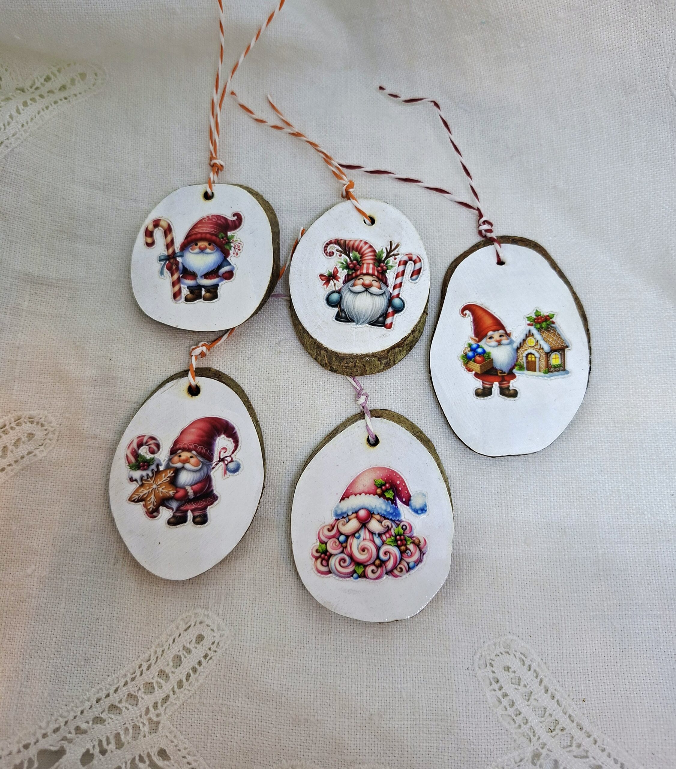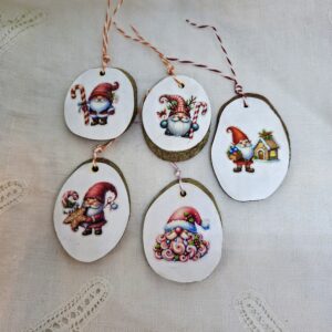 Vsak okrasek je dekoriran z decoupage tehniko ter je 2-3 krat prelakiran z vodoodpornim lakom.