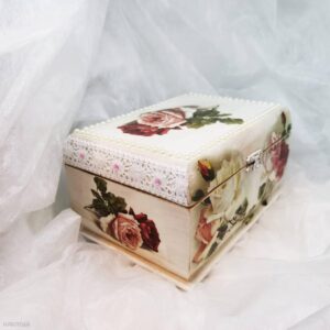 Lesena skrinja je dekorirana z decoupage tehniko in čipkami, biserčki.