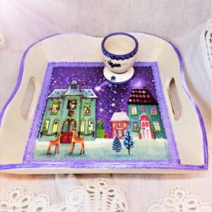 Vsak pladenj je dekoriran z decoupage tehniko in čipkami ter 4 krat prelakiran z vodoodpornim lakom.