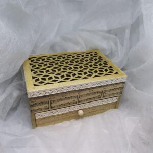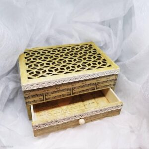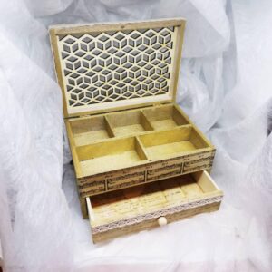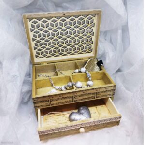 Vsebuje: spodaj mali predalček in zgoraj 5 prostorov za nakit, znamke, drobne stvari, denar.