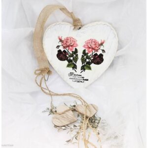 Leseno srce – Dve vrtnici – Ko ljubimo, vsak trenutek doživljamo kot čudež. Dimenzija: 18 x 1 x 18 cm. Vsako SRCE je dekorirano z decoupage tehniko in čipkami ter je 3-4 krat prelakirano z vodoodpornim lakom. Nekatere tablice imajo dodano vrvico s kljukicami, na katere lahko napišete kratka sporočila ali pa pozitivne misli. Primerno za darilo za rojstne dneve, za obletnice, za otvoritev stanovanja, za poroke, Valentinovo, 8. marec. Zaradi čudovitih motivov in zaradi oblike srca, naj vam ta dekor obogati vaš kotiček v stanovanju.