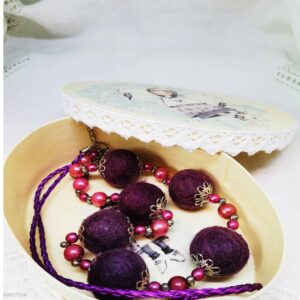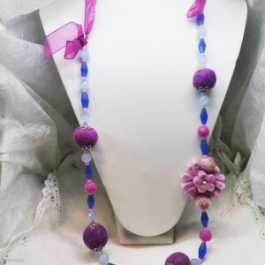 Ogrlica je iz polstene volne, v spomladanskih barvah vijolice.