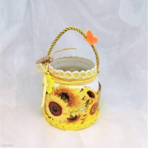 VAZA steklena – sončnice. Različni motivi – vrtnice, lavanda, zvončki, morska, s peskom, sončnice, metulj, srce. Velikost cca 10 x 10 cm. Lahko jo uporabite kot vazico za rože ali pa kot vazo za mini svečke. Lahko v njej hranite tudi kuhalnice ali pa različna pisala, barvice, čopiče.
